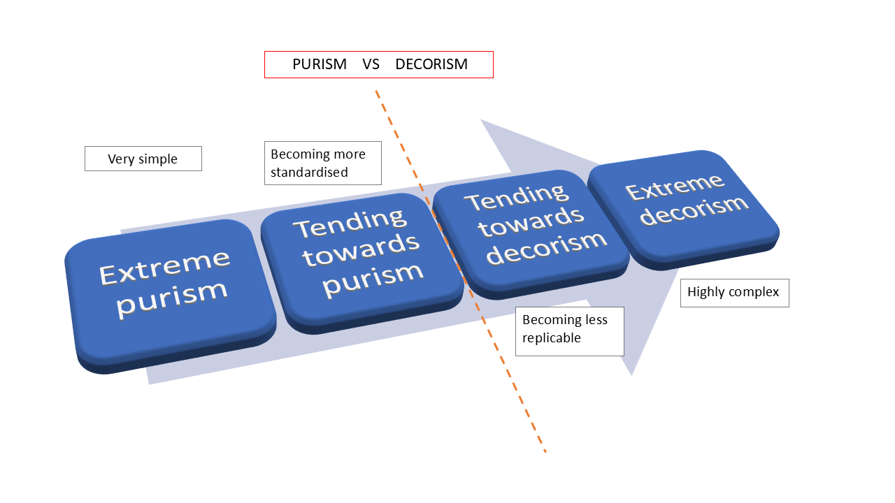 This spectrum helps us see how some buildings lean more towards purism—simple forms, easy to copy, and super efficient—while others go for decorism, with lots of ornament, uniqueness, and complexity inspired by art or nature. Most real-world designs don’t sit at the extremes, but instead find a balance between practical needs and creative expression, between what’s standard and what’s one-of-a-kind.